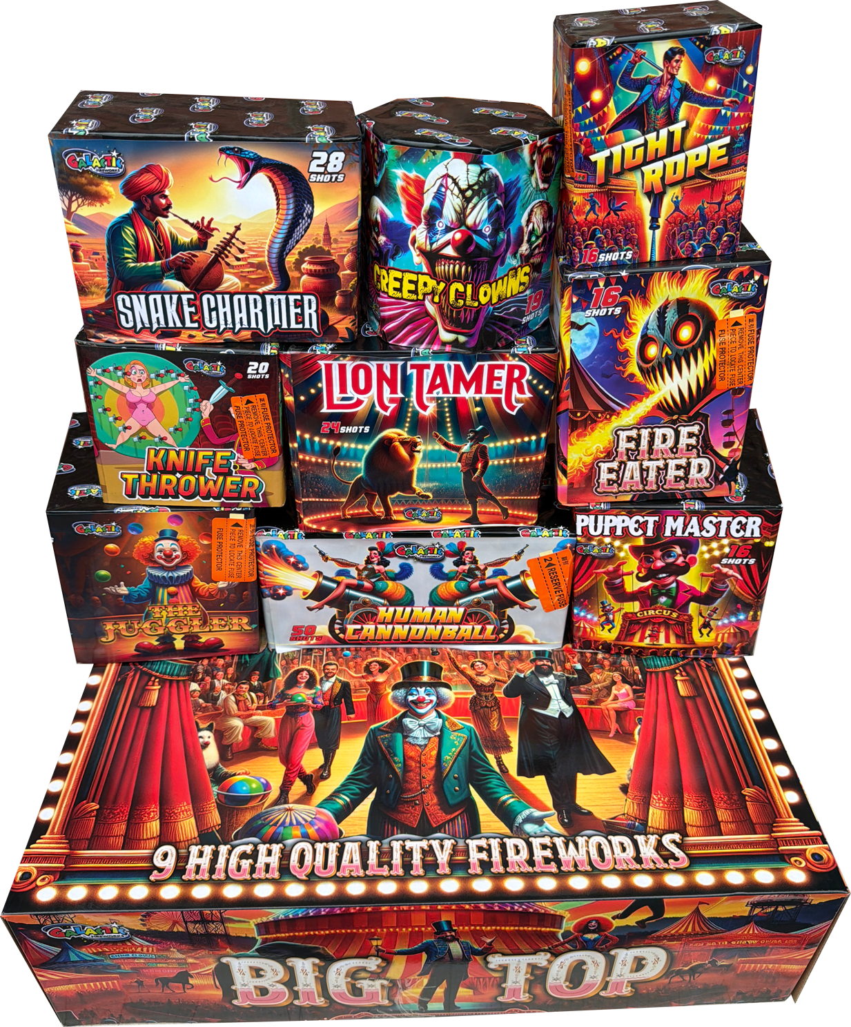 Each firework in the "The Big Top" pack is a showstopper in its own right. From the deceptively powerful "Creepy Clowns" to the dazzling "Puppet Master" and last year's best-seller, "Human Cannonball," this selection is designed to dazzle and amaze.