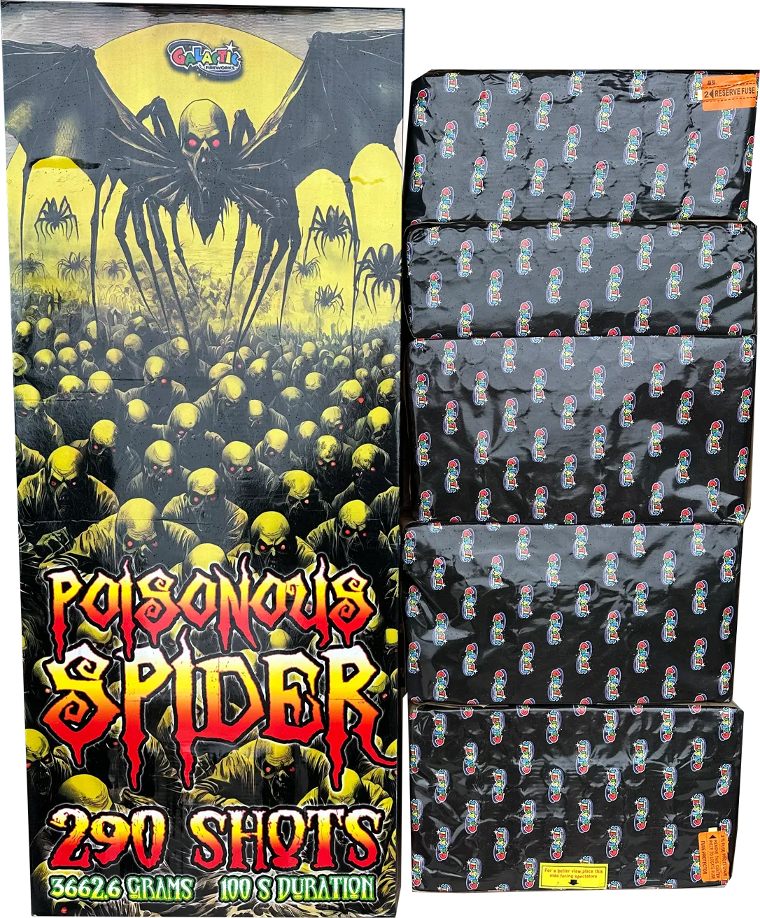 We call this "The Coffin" for a reason. Just look at the size of the box. The Poisonous Spider is an absolute unit of a compound that demands respect before you even take the lid off. But it’s not just a big box; its performance is second to none! You are looking at a staggering 290 shots that fire relentlessly for a minute and forty seconds, filling the sky with colour and noise.