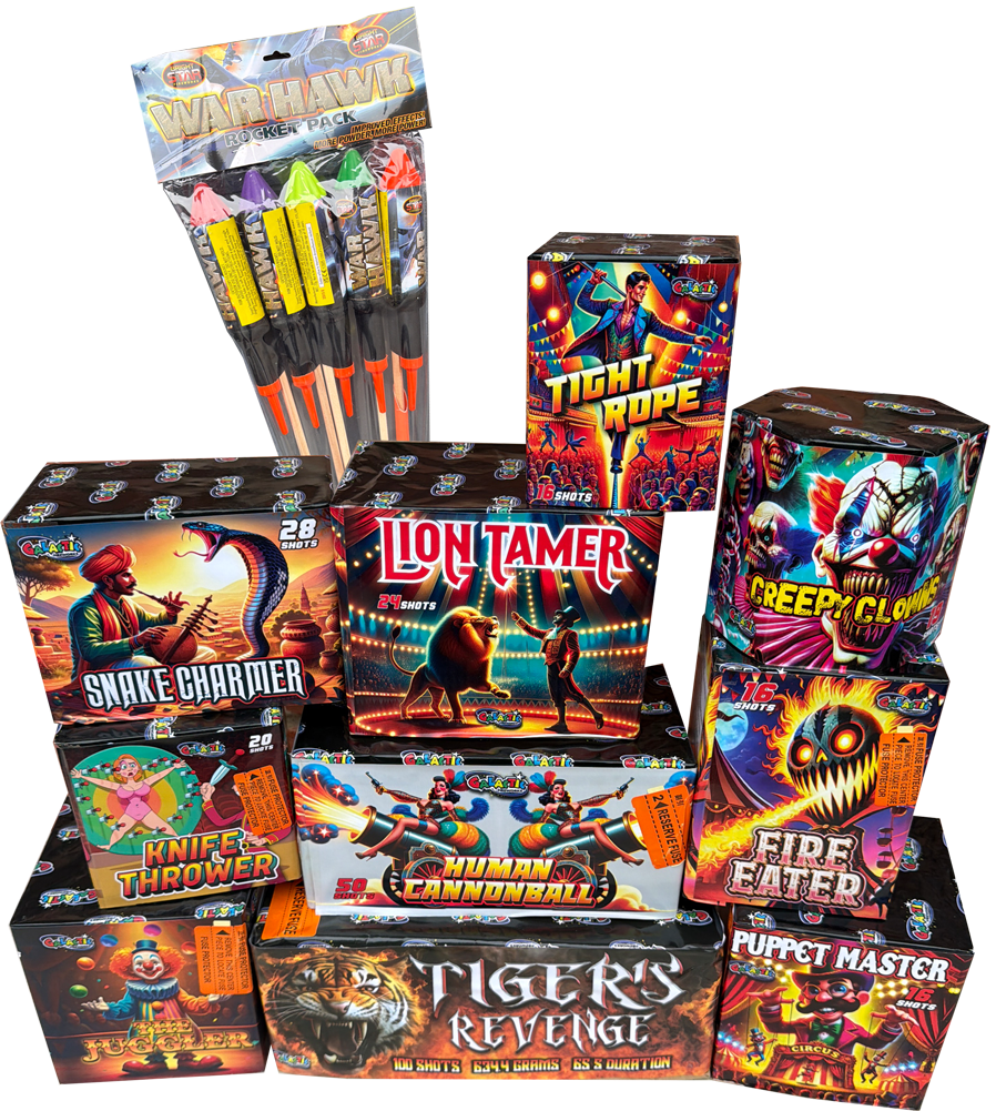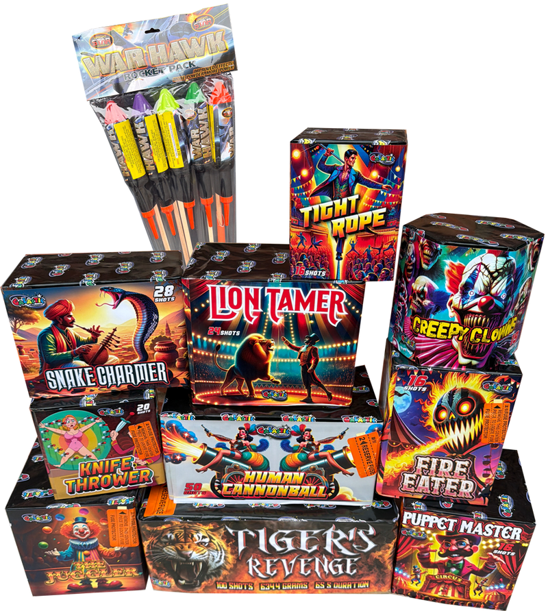 We recommend kicking things off with the Big Top—a massive pack of nine individual cakes that delivers long-lasting, high-variety performance to get the crowd going. Once you’ve worked through those, ramp up the intensity with the Tiger’s Revenge. This 100-shot beast is relentless, firing rapid pearls and crackling bouquets that drastically increase the pace. Finally, you have the legendary War Hawk Rockets. You can either fire these throughout the show for high-altitude punches or save them for a deafening five-rocket volley at the very end to finish your night with a massive salute.