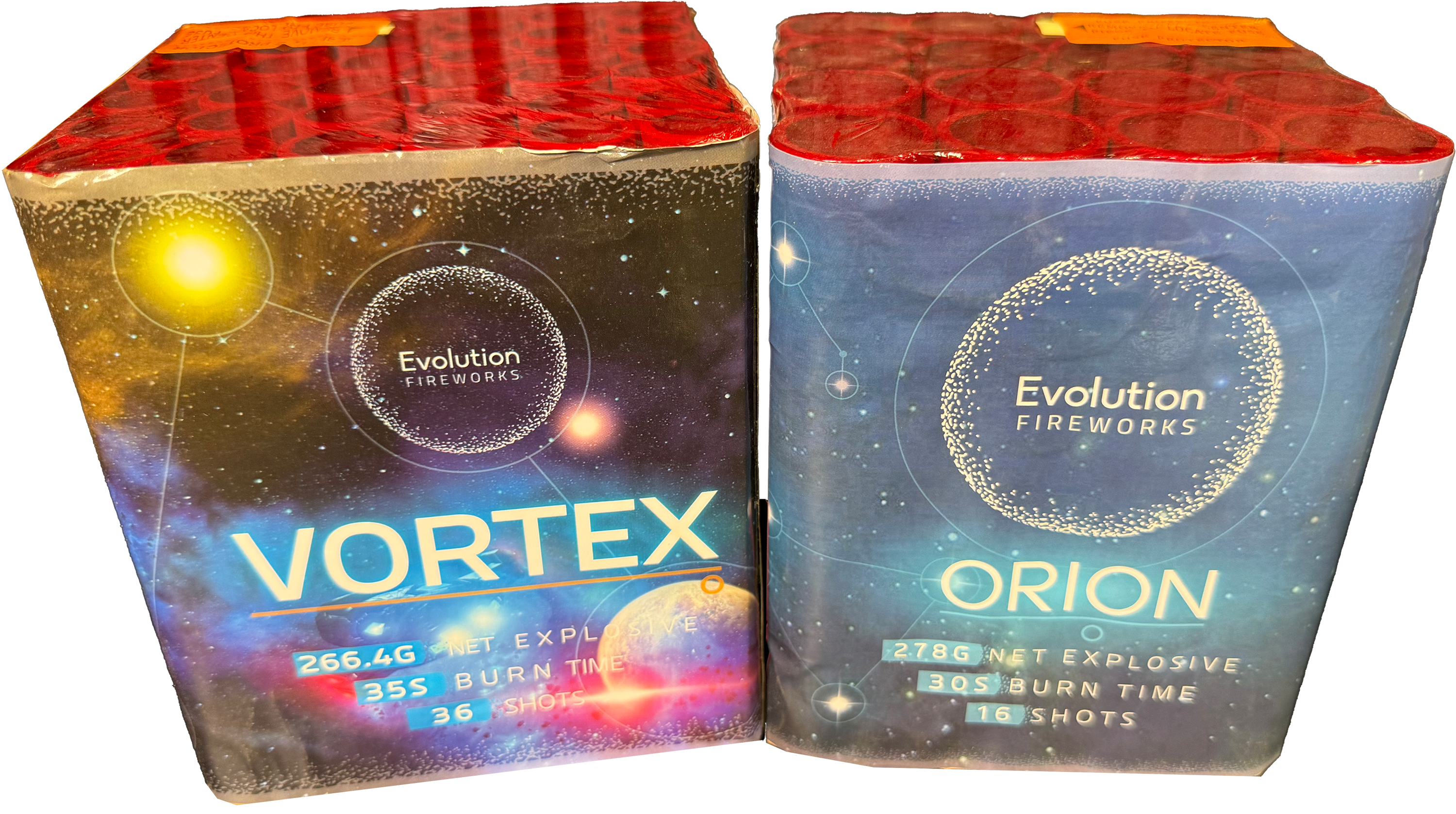 Talk about a power couple. This twin pack from Evolution Fireworks gives you two completely different animals in one deal: the visual elegance of Orion and the sonic chaos of Vortex.