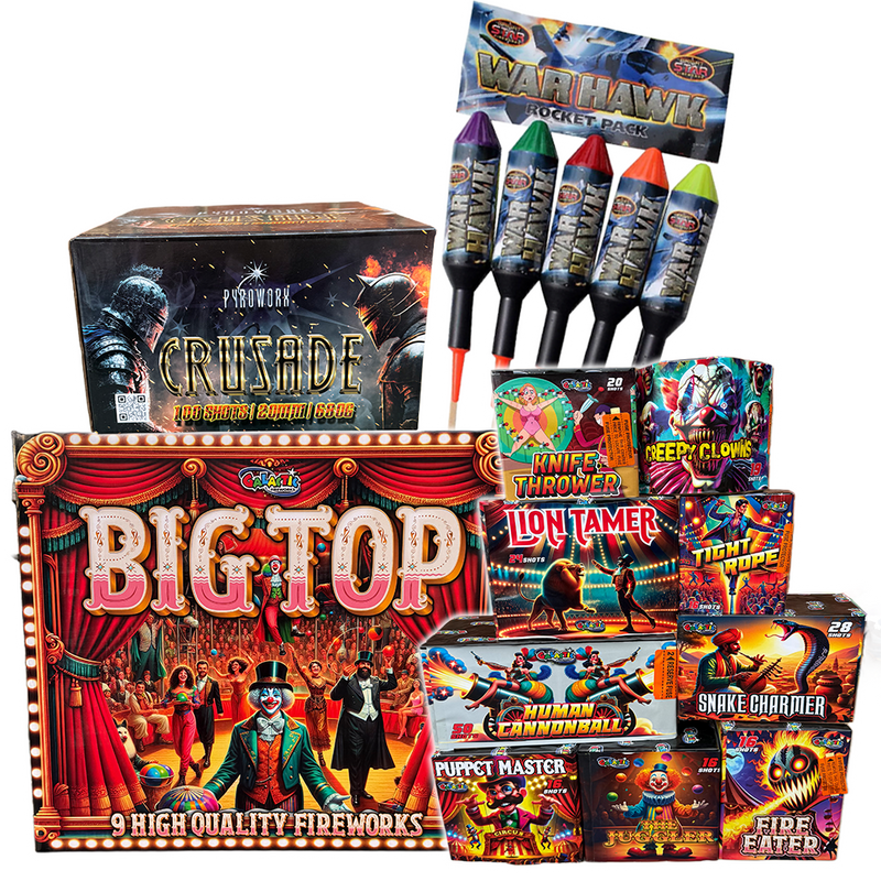 Here you're getting a display FULL of quality. A Big Top cake pack, 9 incredible multi-shot cakes plus a simply stunning finale piece in Pyroworx's 100 shot Crusade, add a pack of the legendary War Hawks: 5 stunning, high-powered bursts. Everything you need for a fantastic display.