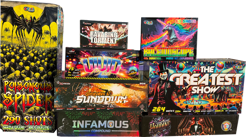 Each pack includes a variety of fireworks such as fountains, roman candles, small cakes and rockets. Larger packs may include compound cakes or finale pieces for a professional finish.