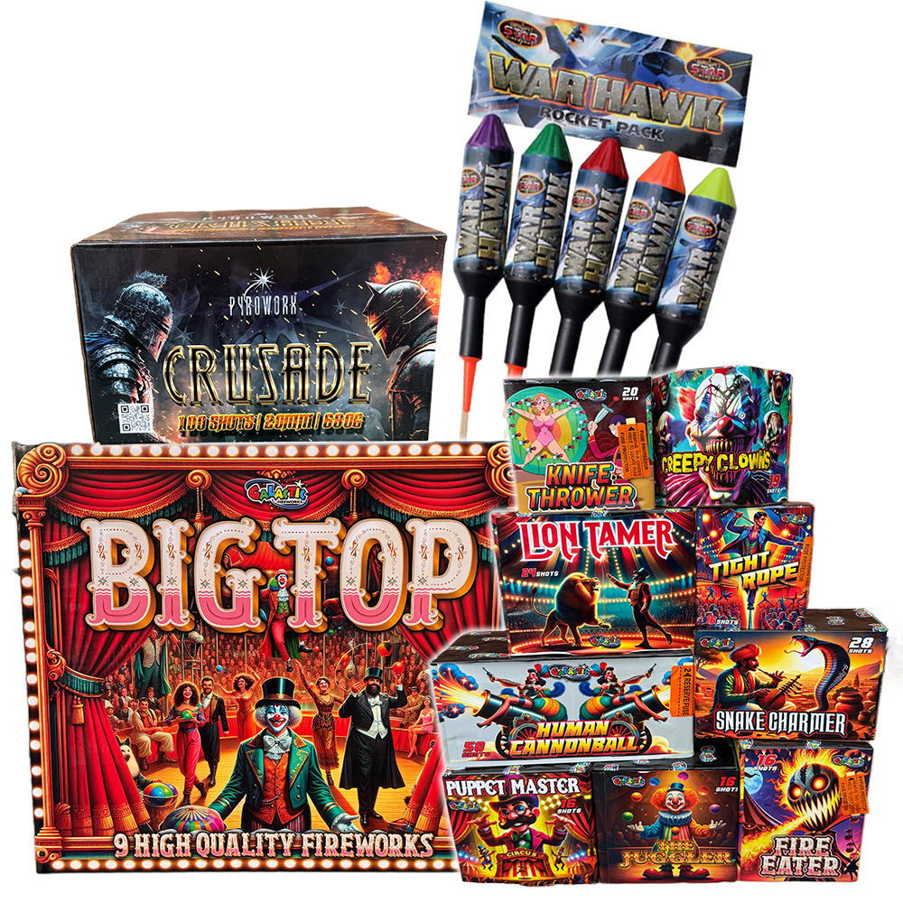 Each pack includes a variety of fireworks such as fountains, roman candles, small cakes and rockets. Larger packs may include compound cakes or finale pieces for a professional finish.