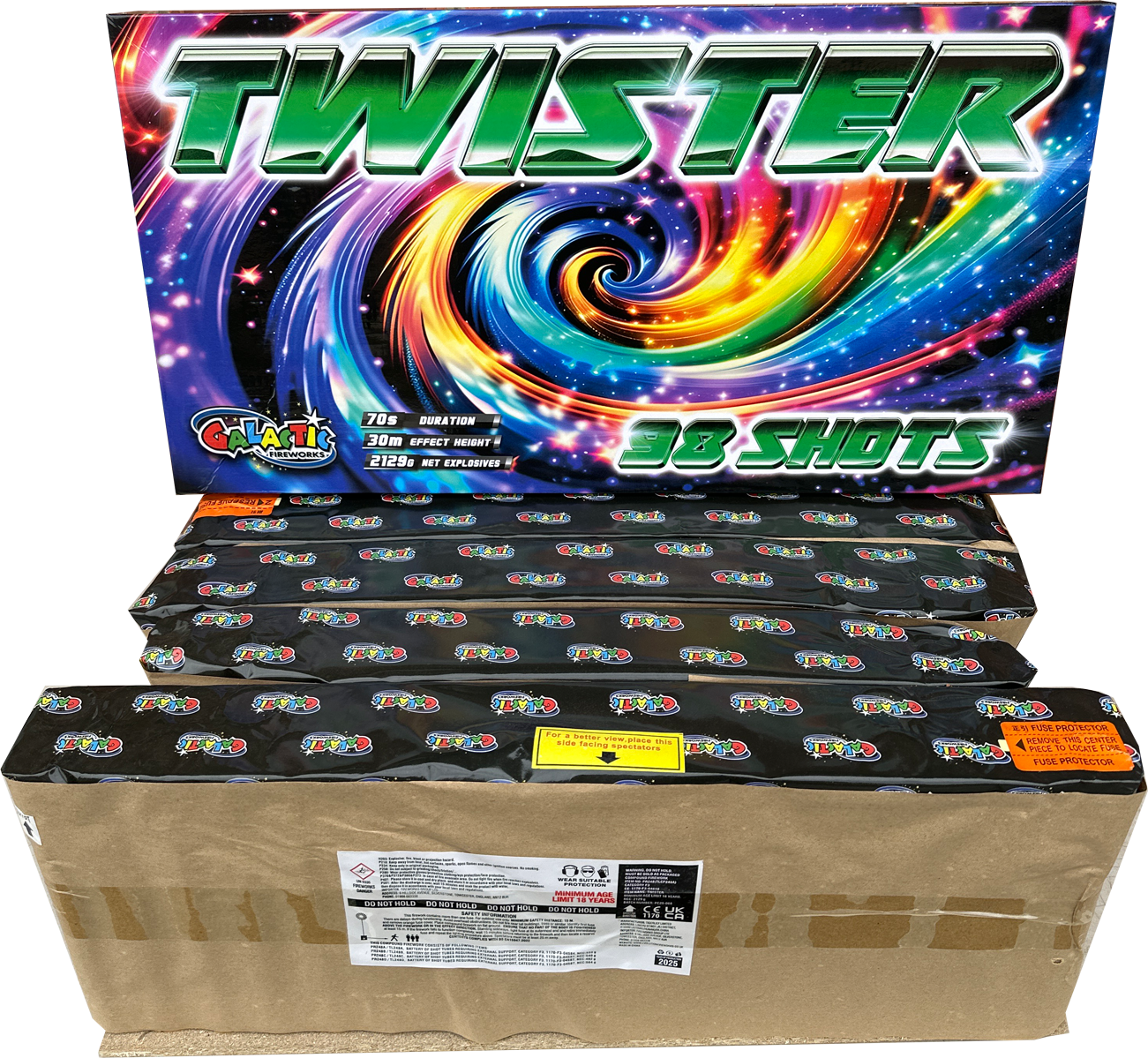 Twister isn't just any firework - it's a compound spectacle that goes beyond the ordinary to create a sky masterpiece. Packed with over 2kg of explosive pyro powder, you'll be greeted by a spectacle of gleaming golden tourbillions, unravelling left and right, this pyrotechnic titan effortlessly ascends into the night sky, painting a canvas of mesmerising bursts. This is genuinely a professional's choice of firework for the best displays in the UK!