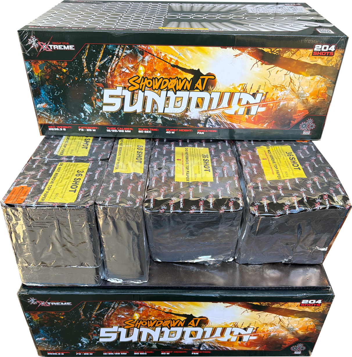Showdown at Sundown rolls in like the moment the sheriff steps out onto the street. This is a 204-shot beast from the Xtreme range that rolls into town and absolutely dominates.
