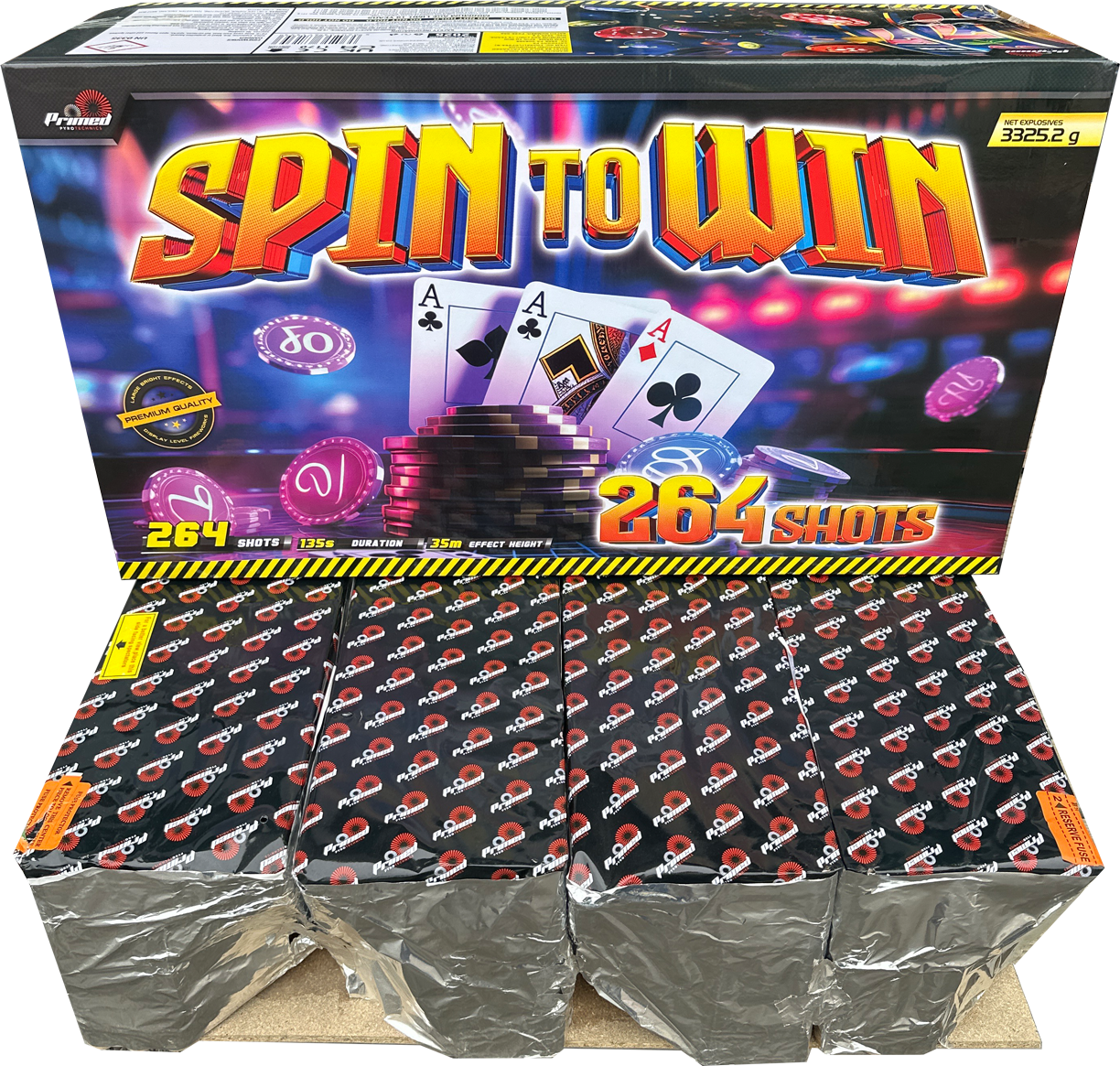 Spin To Win is a flagship compound from Primed Pyrotechnics that delivers a jackpot-winning performance. This is a massive unit, packing a staggering 264 shots and over 3.3kg of powder into a single display that lasts for more than two minutes.