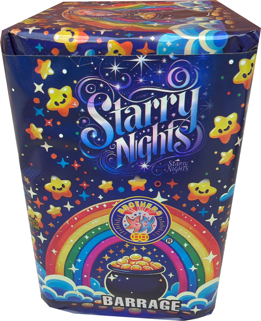Starry Nights (formerly known as Starring) is a fantastic little budget buster from Brothers Pyrotechnics. Ideally suited for smaller garden displays, this 16-shot cake proves that you don't have to spend a fortune to get a bit of sparkle in the sky.