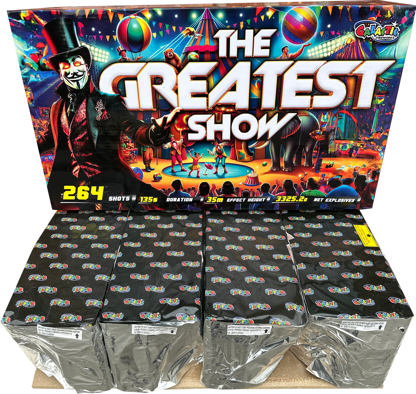 The Greatest Show is a spectacular 254-shot compound that serves as a complete display in a single box. Weighing in at a hefty 27kg and packing over 3.3kg of powder, this is a serious piece of pyrotechnic engineering designed to be the centerpiece of your evening.