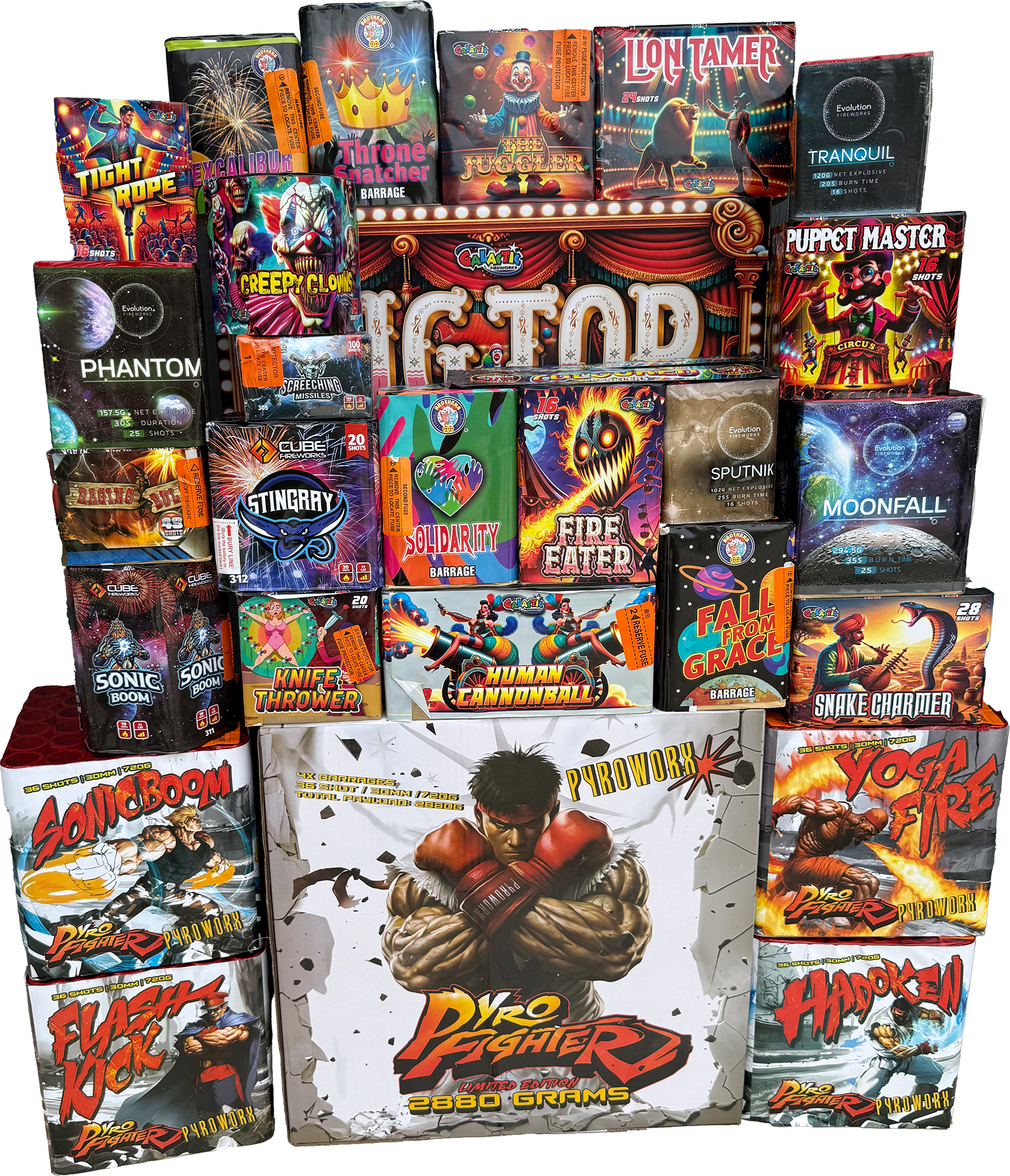 This is a monstrous 60kg package containing 25 premium fireworks. It isn't a random assortment thrown together; it is a carefully curated sequence that blends the variety of the Brothers Choice selection, the circus-themed fun of the Big Top range, and the sheer, heavy-hitting power of the Pyro Fighter cakes. You get over 7.3kg of powder in total, which is enough to keep an audience captivated for a solid 20 minutes.