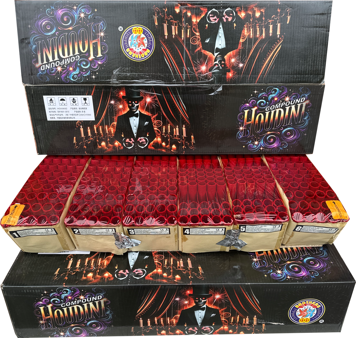 Almost 3000 grams of pyro powder (ignore what it says on the box) mean that Houdini is genuinely one of the very best compounds that we have ever seen. Don't take our word for it watch the video where you can see our van parked at the bottom of the screen. Massive quality breaks that spread across the entire sky, simply stunning!