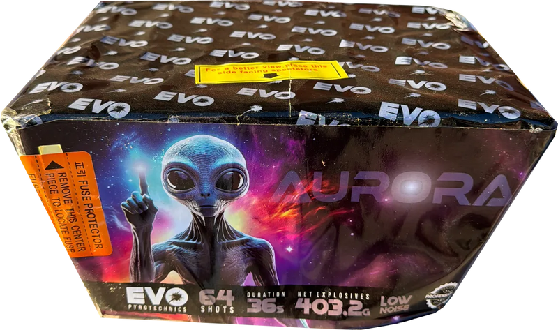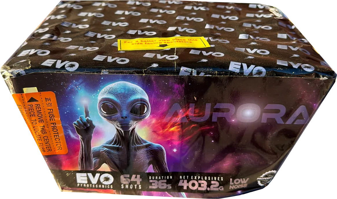 Dancing lights in the night sky — that's literally what Aurora sets out to replicate. Evolution Fireworks have built a 64-shot fanned cake that sweeps colour across the sky in waves, mimicking the shimmer and flow of the Northern Lights.