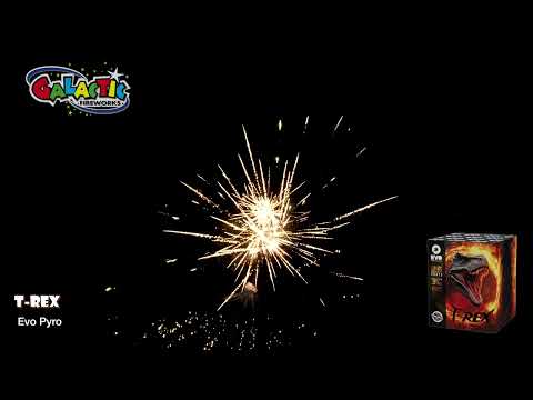 T Rex is a firework that packs a punch, firing alternating bursts of brocade crowns with vibrant red glitter and brocade crowns with shimmering white glitter.