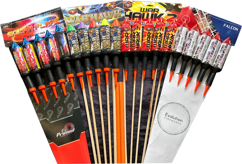 The ultimate assortment of top-quality, big-break rockets that offer unbeatable value for money. Twenty high-performance rockets from a variety of manufacturers, this mixed pack guarantees a mesmerizing display that will leave your audience in awe.