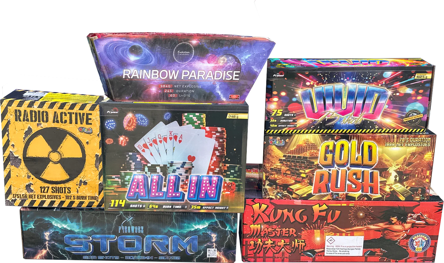 Inside, you’ll find a stunning variety: the vivid, colourful pearls of Rainbow Paradise, the sweeping golden willows of Gold Rush, and plenty more heavy hitters to keep your audience glued to the sky. Each compound has been chosen for its power and performance, giving you a line-up that's display-level.