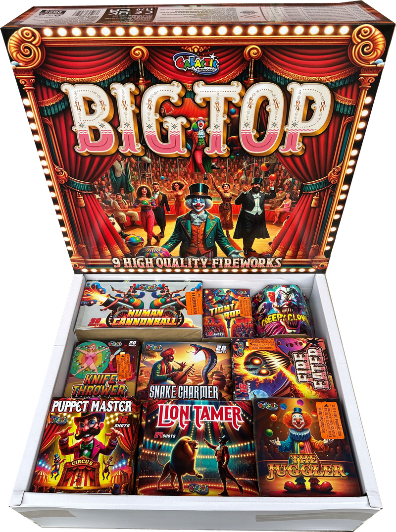 Each firework in the "The Big Top" pack is a showstopper in its own right. From the deceptively powerful "Creepy Clowns" to the dazzling "Puppet Master" and last year's best-seller, "Human Cannonball," this selection is designed to dazzle and amaze.