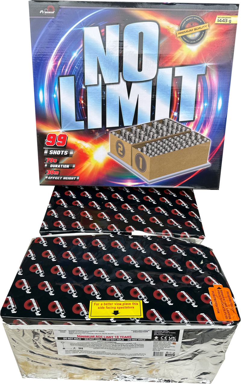 No Limit combines two humongous fireworks in one seamless, perfectly coordinated display. Ignite a single fuse, and watch in awe as the first firework lights up the sky, followed automatically by the second. This innovative compound design ensures an awe-inspiring spectacle that is nothing short of breathtaking.