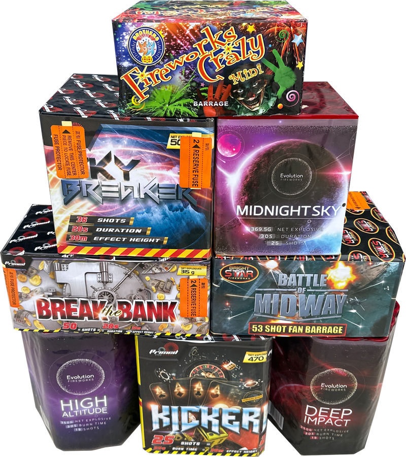 Inside you’ll find powerful breaks from Sky Breaker, Kicker, Deep Impact, and High Altitude—each delivering sky-filling bursts. And, to keep things lively, the rapid-firing Fireworks Crazy Mini adds pace and colour with its cracking mix of effects.