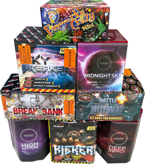 • Cakes & Barrages – single-ignition fireworks for a complete mini display.