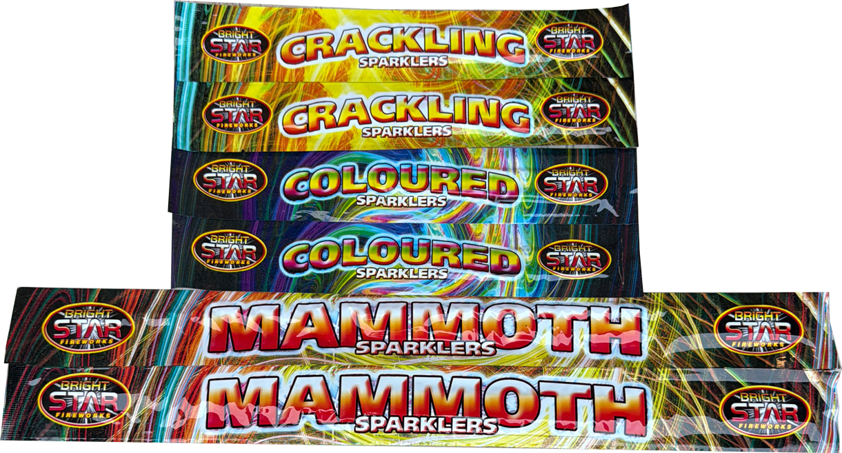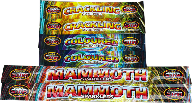 2x packs 18" Mammoth Golden Sparklers (8)2x packs 10" Crackling Sparklers (10)2x packs 10" Coloured Sparklers (10)