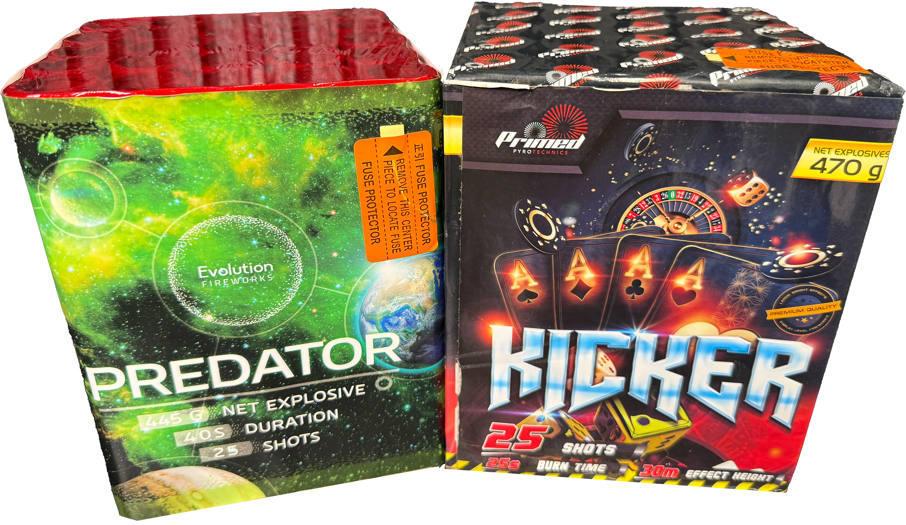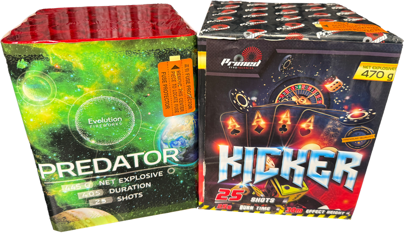 We have paired up two absolute heavyweights here: Kicker and Predator. For one low price, you are securing two high-performance cakes that are absolutely stuffed with powder. We are talking about a combined 950g of NEC. When you break that down across the 50 shots, you are looking at nearly 20g of powder per tube—that is dangerously close to the legal limit for straight-firing cakes.